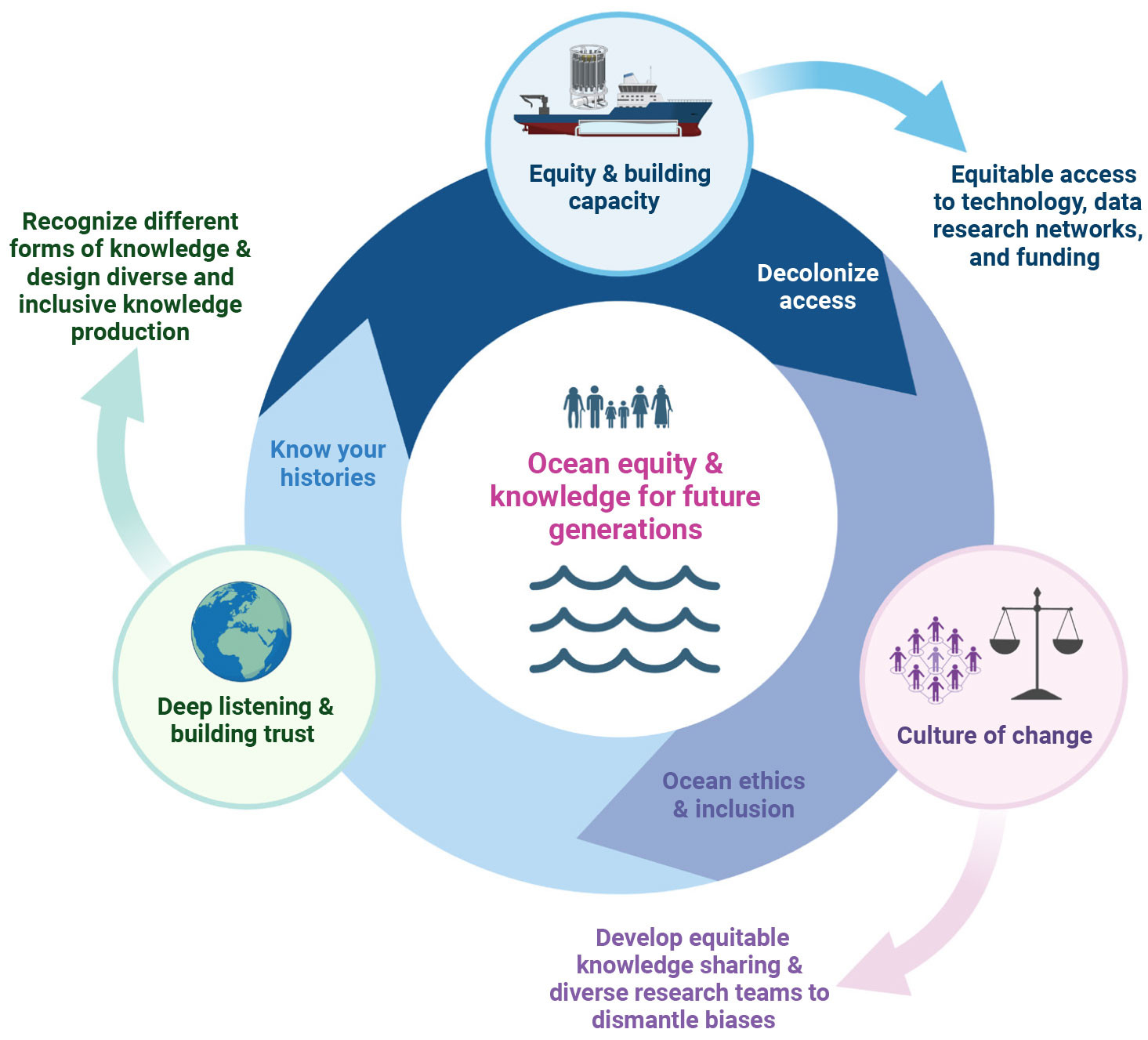 Based on our experience through this course and facilitated discussions, we suggest three directions to make knowledge production more accessible and equitable. First, know your histories and their legacies in how we conduct science, and practice deep listening and building trust. Second, decolonize access and promote building capacity and equitable access to technology, data, and funding. Finally, develop ethical ocean science in inclusive terms and promote a culture of change.